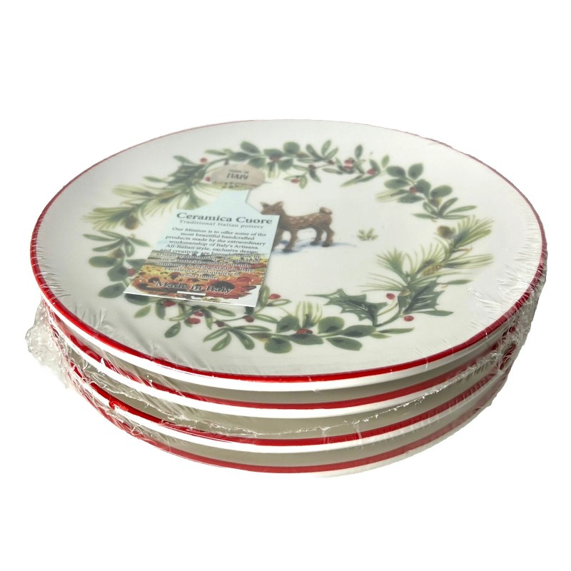4 CERAMICA CUORE Salad Desert Plates 8.25" Deer Doe Holly Berries Italy. Sealed in plastic.