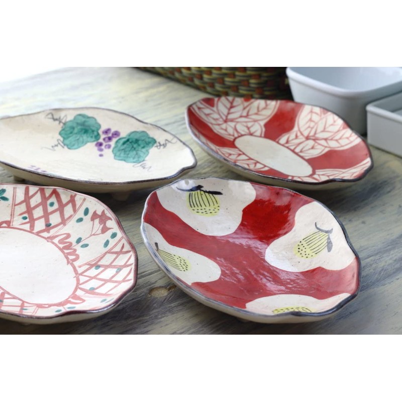 Cerapockke Aka-e Sanyoshi Boiled Fish Look Good Hand-Painted Three-legged Oval Plate, 8.7 inches (22 cm), Red Dami Camellia