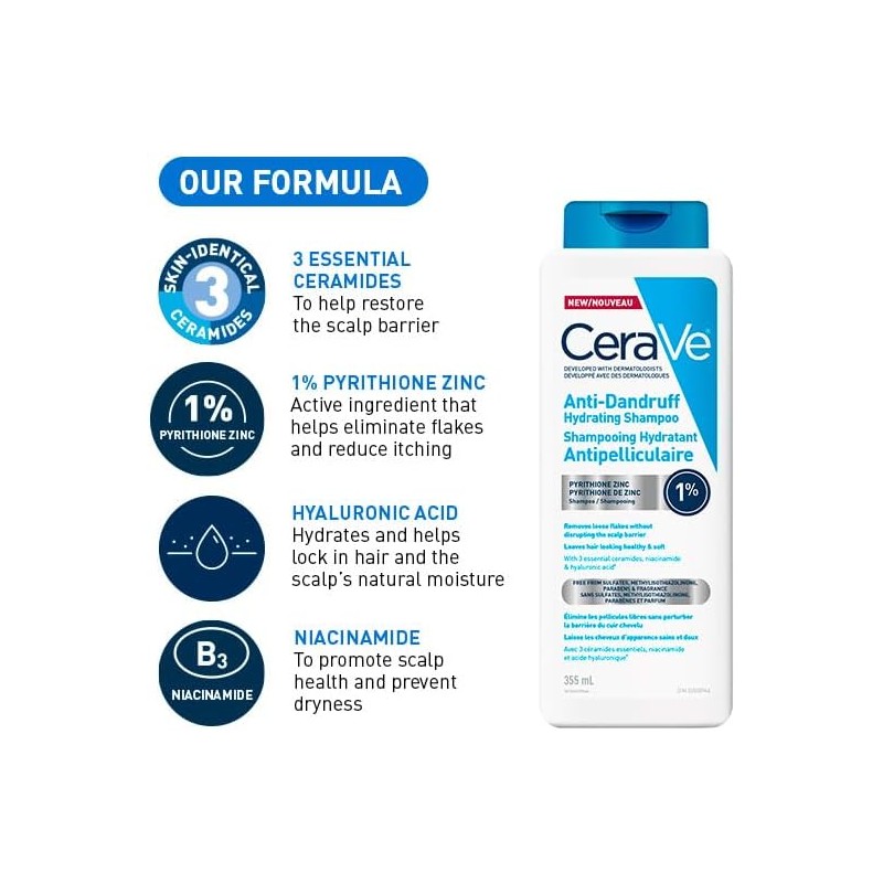 CeraVe Anti-Dandruff Hydrating Shampoo is clinically proven to eliminate visible flakes without disrupting the scalp barrier.* This dandruff shampoo, enriched with 1% pyrithione zinc, is gentle on both your hair and scalp, effectively reducing itching and irritation. Developed with dermatologists, this formula is suitable for all hair types and includes three essential ceramides, niacinamide, and hyaluronic acid. When used in conjunction with CeraVe Anti-Dandruff Hydrating Conditioner, it removes buildup without stripping away moisture, leaving your hair feeling healthy and soft. Both the anti-dandruff shampoo and conditioner are pH-balanced, non-comedogenic, allergy-tested, sulfate-free, dye-free, paraben-free, and fragrance-free.*with regular use as a system