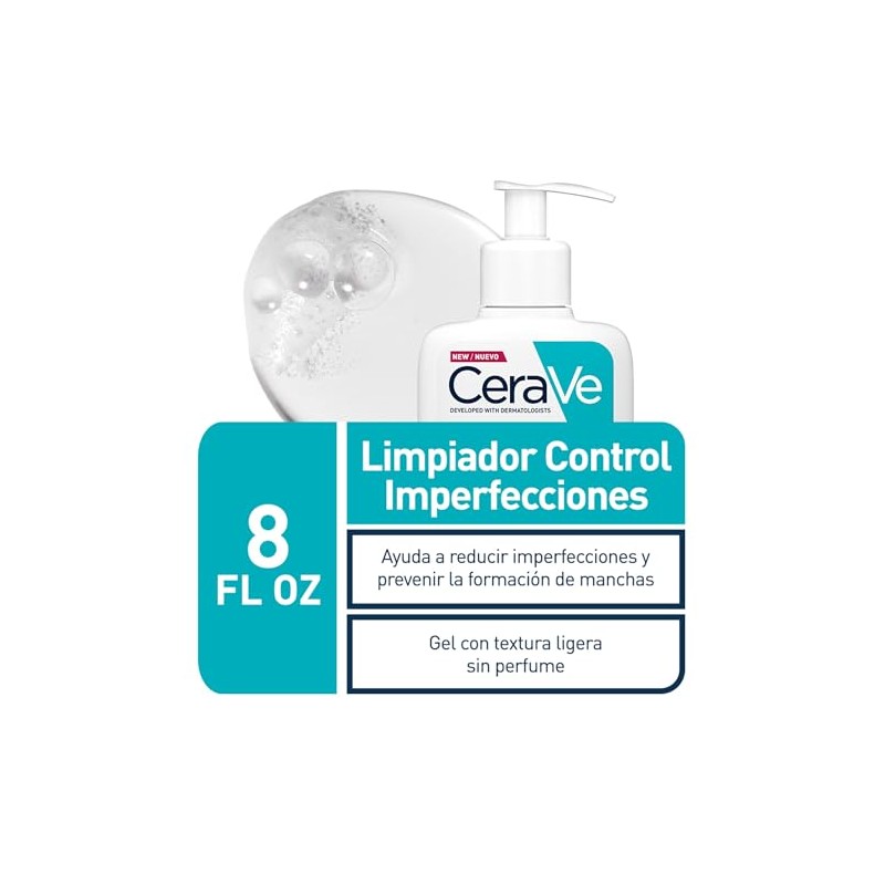 CeraVe Limpiador Control Imperfecciones 16oz para piel con tendencia al acn,con cido Saliclico, Niacinamida y Arcilla Purificante.