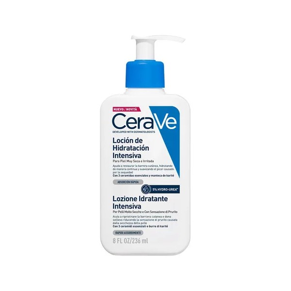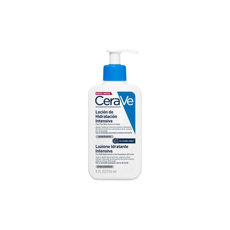 Desarrollada con dermatólogos, la Loción Hidratante Intensiva de CeraVe está formulada con Hydro-Urea™, un complejo único que ayuda a restaurar los factores hidratantes naturales de la piel, 3 ceramidas esenciales, Tecnología MVE y manteca de karité para hidratar intensamente, restaurar y ayudar a reforzar la barrera cutánea.