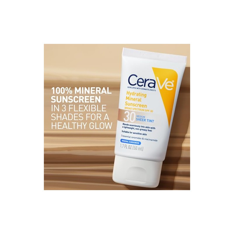 CeraVe Tinted Sunscreen with SPF 30 Hydrating Mineral Sunscreen With Zinc Oxide Titanium Dioxide Sheer Tint for Healthy Glow 1.7 Fluid Ounce