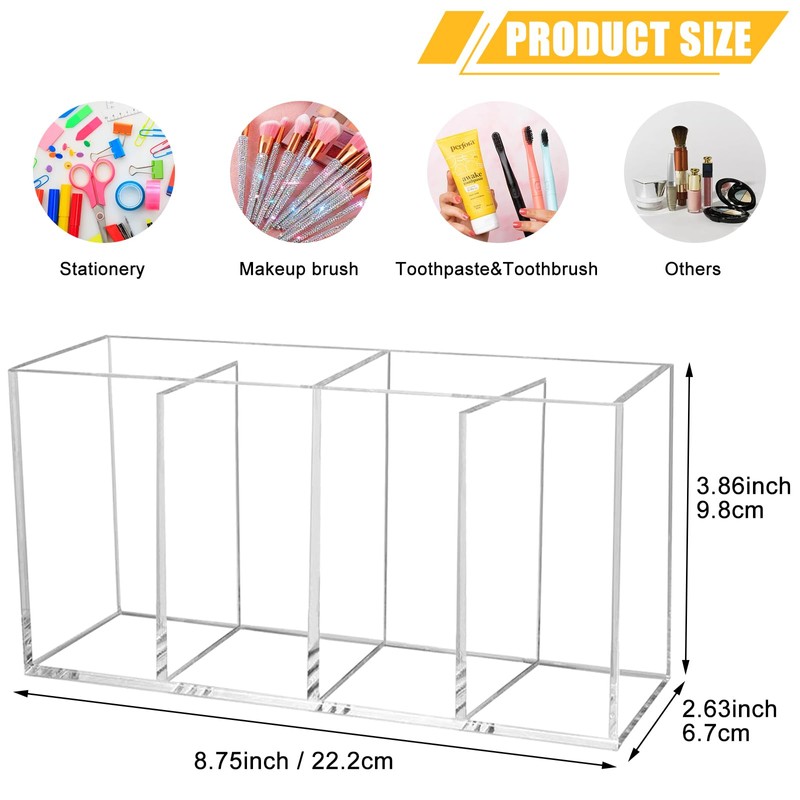 - 【Classic 4 Compartments Design】 Clear makeup organizer has four separate sections hold enough space for plenty of makeup brushes. And also make it convenient to sort your office stationery into an orderly fashion! Keep your makeup brushes in one section and your lip/eye liners, eyebrow pencil and eyelash curler in another.keeps all your stuff well organized,clean and tidy without taking too much space, a real space saver!