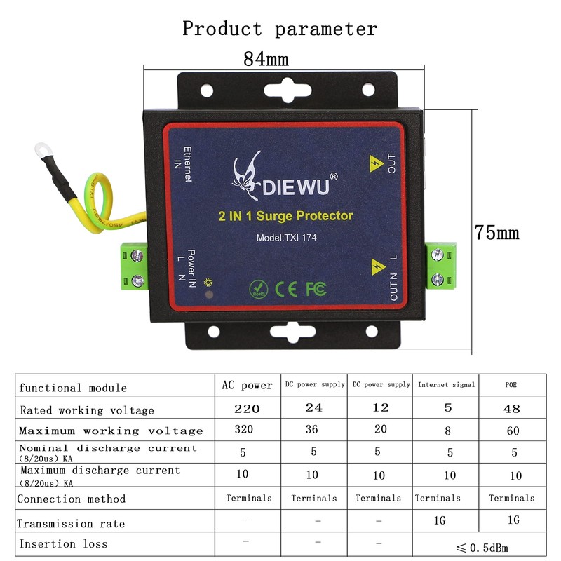 • The 2-in-1 surge protector is designed for power supply and Ethernet arrester surge protection to reduce the surge caused by thunder to the protected equipment.