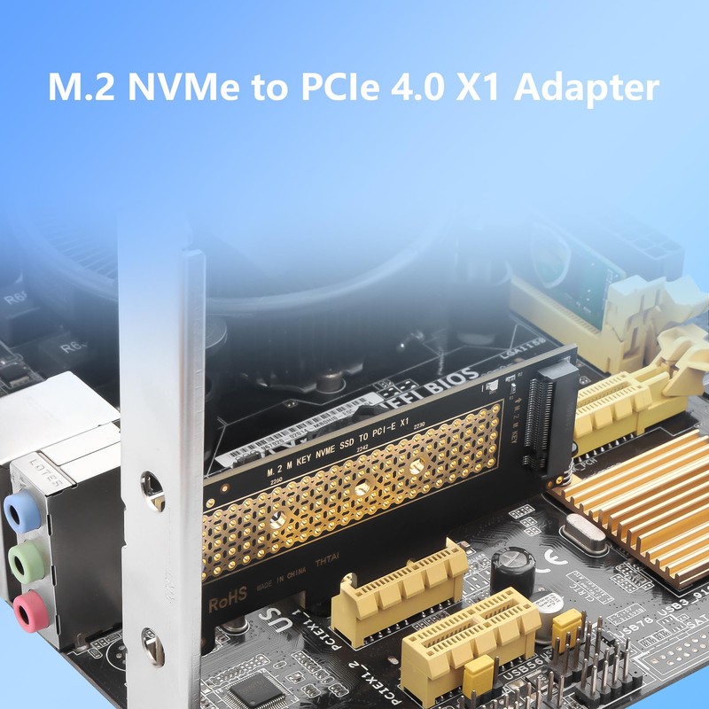 - M.2 to PCIE X1 converter card, the advantage is that it uses the PCIE X1 slot on the motherboard instead of X16 slot, the disadvantage is that its maximum bandwidth is limited to PCIE X1.