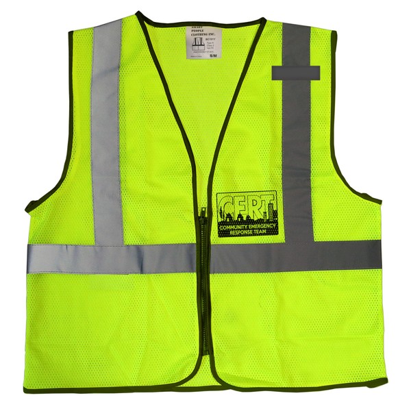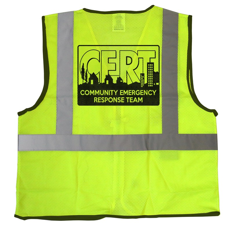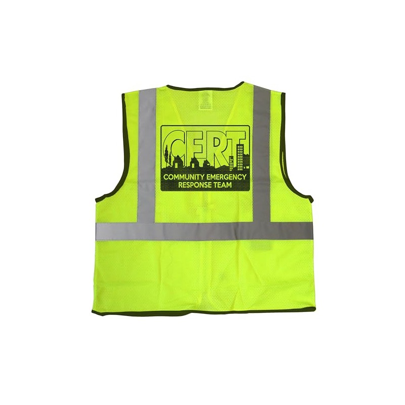 CERT Safety Vest in Safety Green with Black Screen Print Designs Front and Back, High Visibility Vest.