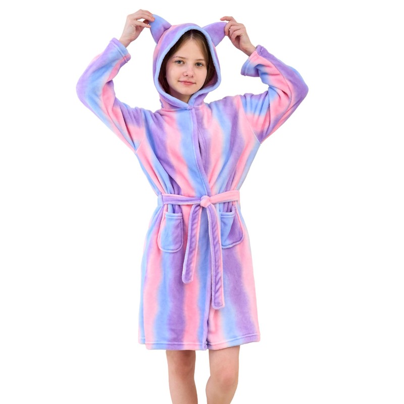 Ceruwum Cat Ears Dressing Gown for Girls - Soft Hooded Robe Sleepwear Kids (Purple Stripes, 12-13 Years)