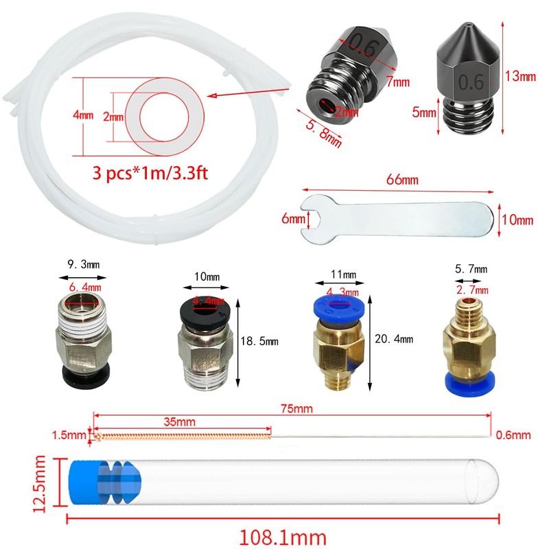 CESFONJER 0.6 mm MK8 Nozzles Hardened Steel Nozzles 6 Pieces with 3 x 0.6 mm Cleaning Steel Needle + 3 x 1 m Teflon Hose + 6 mm Open-End Wrench + PC4-M6-M10 (1P + 1P), for 1.75 mm Filament Ender