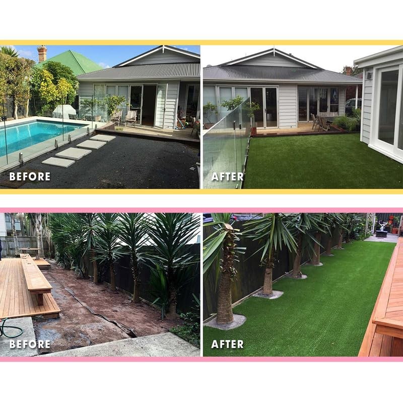 - MAINTENANCE FREE: No mowing, no watering, save time and water. Artificial turf needs no maintenance and looks perfectly fresh and green all year round. Built-in drainage in the backing helps for easy cleanup ,simply hose it when needed.