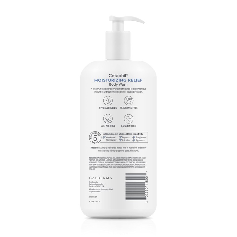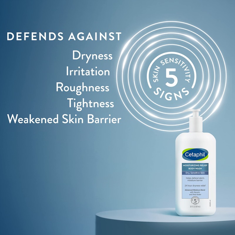 Cetaphil Body Wash, NEW Moisturizing Relief Body Wash for Sensitive Skin, Creamy Rich Formula Gently Cleanses and Gives 24 Hr Relief to Dry Skin,Hypoallergenic, Fragrance Free, 20 oz