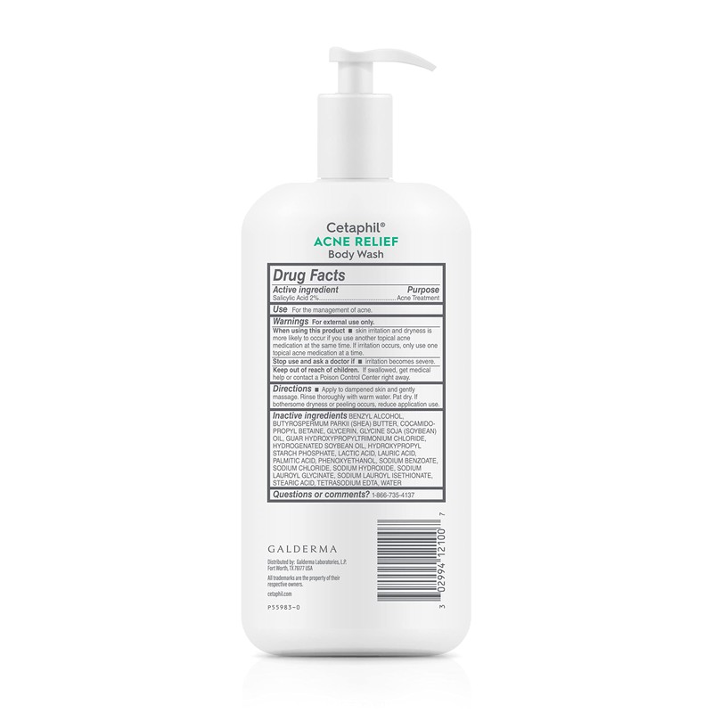 Cetaphil Acne Relief Body Wash is designed to help eliminate and prevent breakouts for those with acne-prone skin. Formulated with an Advanced Moisture Blend made up of glycerin, shea butter and soybean oil to provide 24-hour relief from dryness. This maximum strength over-the-counter acne wash is formulated with OTC 2% salicylic acid to gently exfoliate the skin, eliminate blemishes and blackheads, and prevent breakouts. Dermatologist tested and specifically formulated for sensitive skin, Cetaphil Acne Relief Body Wash is hypoallergenic, fragrance, paraben and sulfate free.