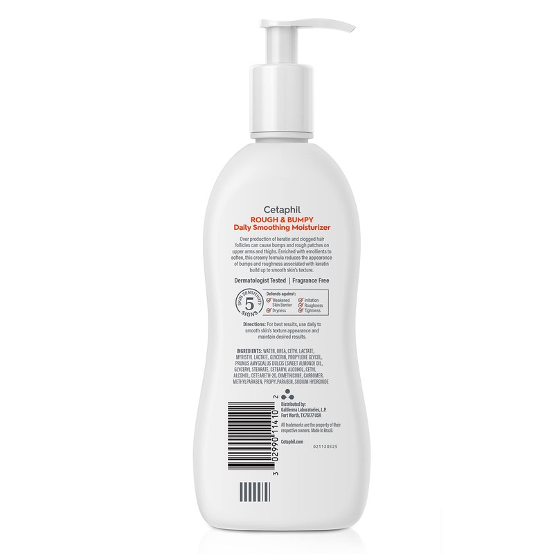 CETAPHIL Daily Smoothing Moisturizer for Rough & Bumpy Skin is specially formulated with 20% urea to boost skin's moisture while gently exfoliating to reduce appearance of bumps and smooth rough skin. This clinically proven formula smooths, soothes and reduces appearance of redness or discoloration on rough and bumpy patches that are common on the upper arms and thighs and cheeks. 93% of clinical subjects reported that their skin was significantly less rough in just one month. The lightweight formula defends against 5 signs of skin sensitivity and is non-irritating, non-sensitizing (with no acidic exfoliants), fragrance free and dermatologist tested on rough and bumpy, sensitive skin.