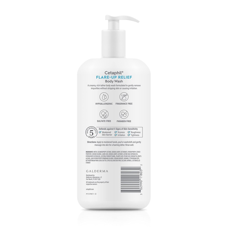 CETAPHIL Flare-Up Relief Body Wash gently cleanses while helping to soothe stressed and reactive skin during flare-ups of dryness. Formulated with an Advanced Moisture Blend made up of glycerin, shea butter and soybean oil to provide 24 hour relief from dryness. Colloidal oatmeal helps to soothe and condition the skin, while Filaggrin technology rich in amino acids helps repair the skin's moisture barrier to help prevent future flare-ups. Dermatologist tested and specifically formulated for sensitive skin, CETAPHIL Flare-Up Relief Body Wash is hypoallergenic, fragrance, paraben and sulfate free.