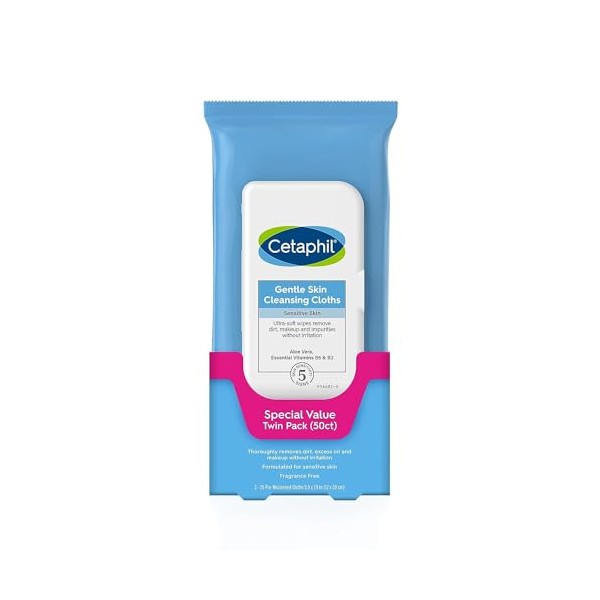 Cetaphil Face and Body Wipes, Gentle Skin Cleansing Cloths, 50 Count, Twin Pack, for Dry, Sensitive Skin, Flip Top Closure, Great for the Gym, Travel, in the Car, Hypoallergenic, Fragrance Free