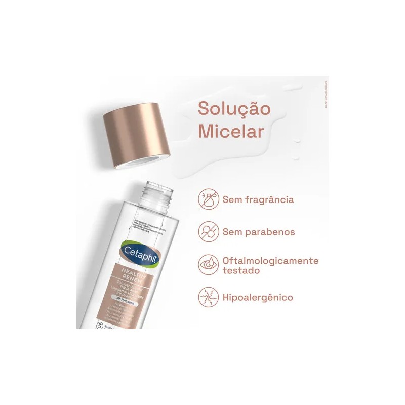 Beneficios del producto: Solución micelar sin alcohol que limpia, calma e hidrata profundamente la piel durante 24 horas, dejándola purificada e iluminada. El primer paso para preparar la piel para una rutina avanzada de cuidado de la piel.Una piel profundamente limpia, purificada e iluminada con una sensación de suavidad, elasticidad y firmeza es posible con Solución micelar hidratante de triple acción Healthy Renew de Cetaphil. Formulada con extracto de edelweiss, extracto de arroz, vitamina B5, glicerina y pantenol, elimina eficazmente los protectores solares químicos o minerales resistentes al agua, el maquillaje, la grasa y la suciedad, dejando la piel purificada y desintoxicada, al tiempo que mejora la luminosidad, la elasticidad, la hidratación y la resistencia de la piel.