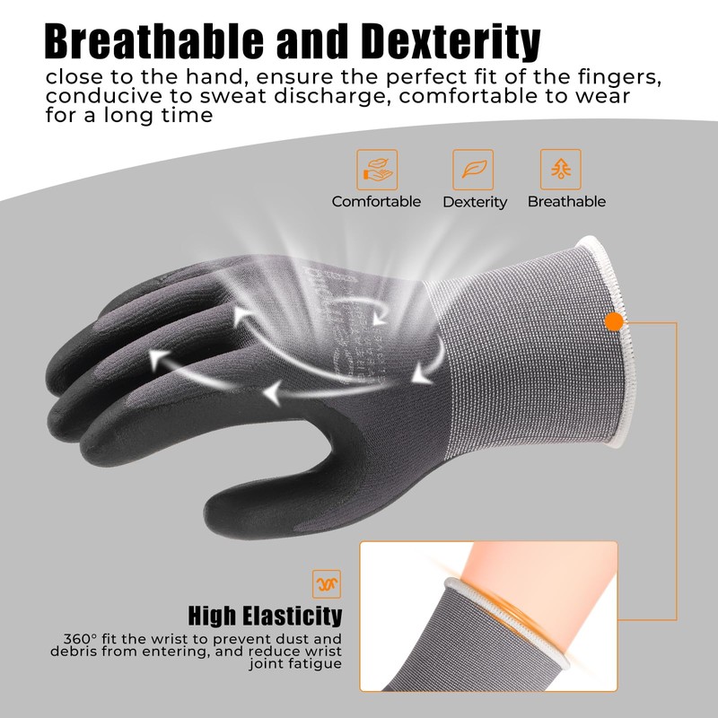 - Anti-slip Nitrile Coating: Micro-foam nitrile coating provides excellent non-slip and waterproof performance in dry, humid and greasy environments, and can easily handle tools, machinery and smooth surfaces