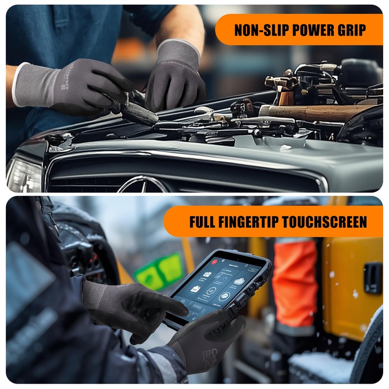 - Superior Grip and Abrasion Resistance: Enhanced nitrile coated palm provides excellent grip and tear resistance and withstands wear and tear from rough surfaces, weak acids and alkaline conditions for long lasting durability.Compatible with touch screen