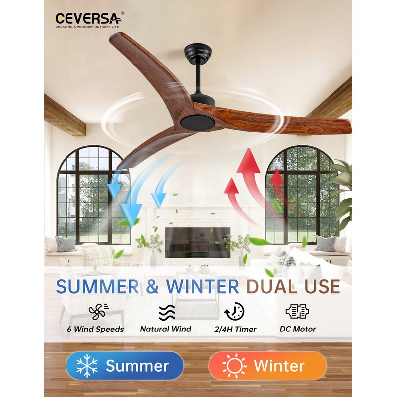 - 【Quiet Reversible DC Motor】Ceversa ceiling fan without light uses solid copper wiring, which makes the motor over 50% more efficient and saves money on your electric bill. The noise level is less than 30 decibels, and the fan moves air downward at high speed in the summer. In winter it can be set to run in reverse to move air upwards