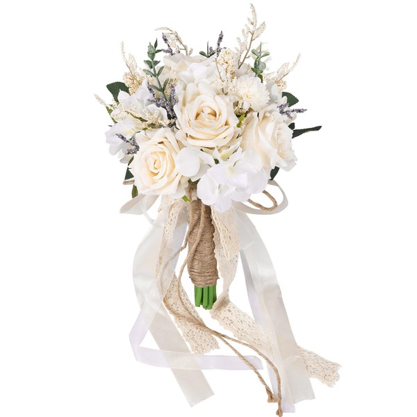 CEWOR Wedding Bouquets for Bride Bridesmaid, White Champagne Artificial Roses Flowers Wedding Decoration (7.5in)