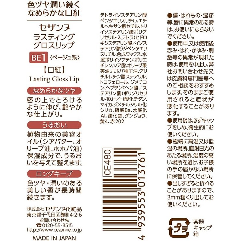 Cezanne Lasting Gloss Lip BE1 3.2g Beige Single Item Gram (x 1)