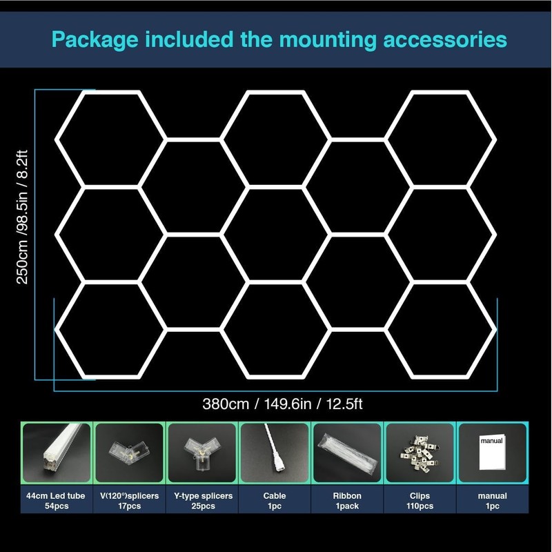 - Super bright & Soft light: PC optical panel lampshade, high light transmittance, high temperature resistance. Built-in high-quality LED chip, hexagon led lights for wall light garage can emit 6500K white light, the light is stable, no flicker, no glare, and not hurt the eyes. Ideal hexagon LED lighting system