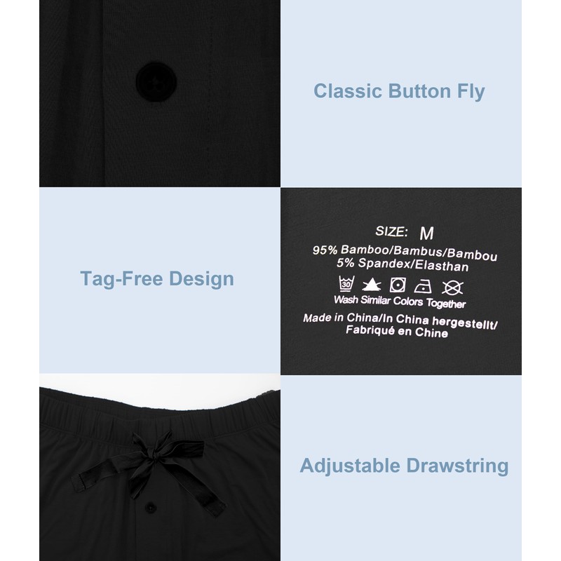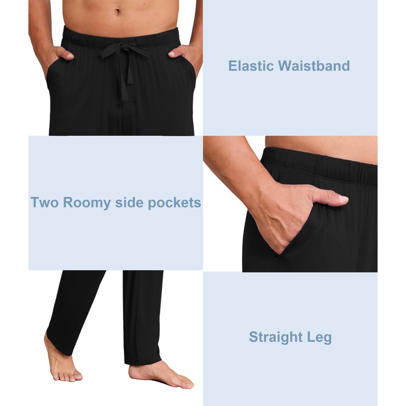 - Soft Material: 95% bamboo rayon + 5% spandex.These mens pajama pants are made of premium fabric,ultra soft,comfy,lightweight,stretchy.Men pj pants feature great breathability and keep you dry and fresh all day long. Perfect for lounging or sleeping