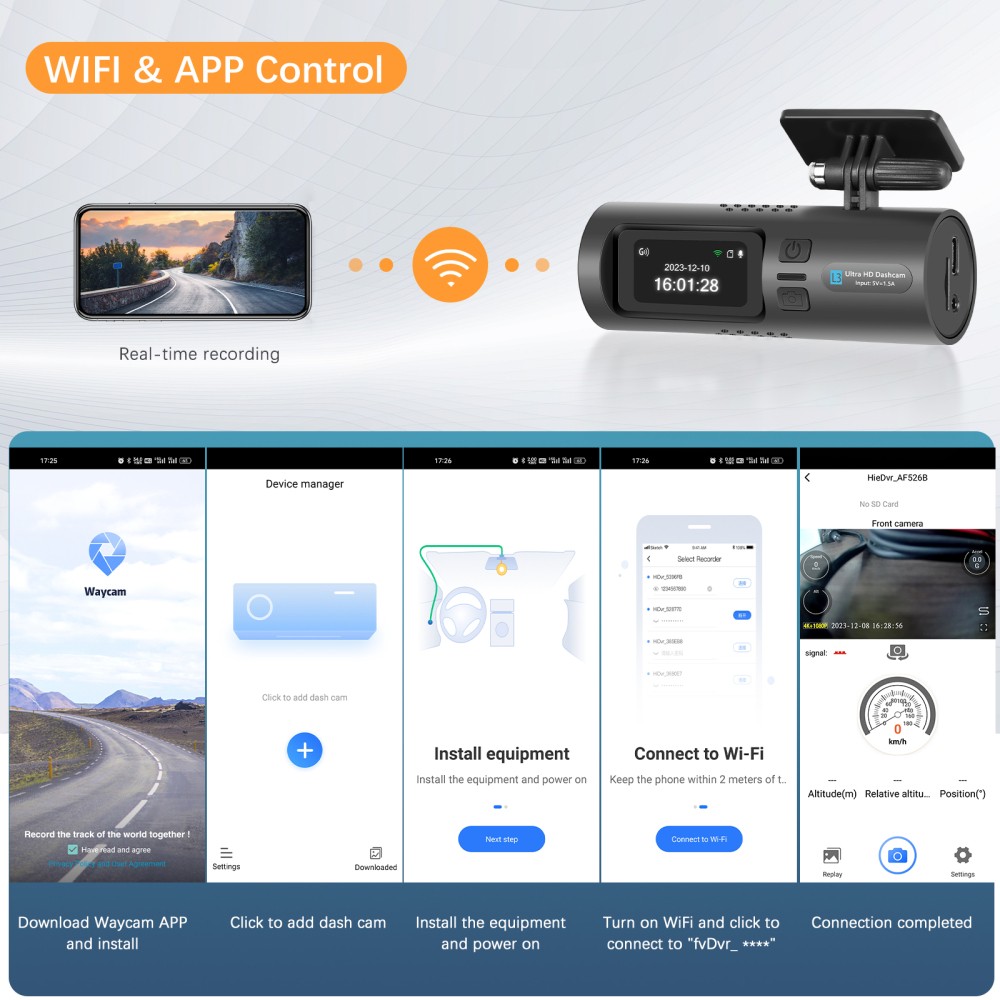 2.WiFi with App Control,You can view and download the videos on smartphone through the dash cam's Wi-Fi and Waycam app, no need to take out the TF card to check on computer.