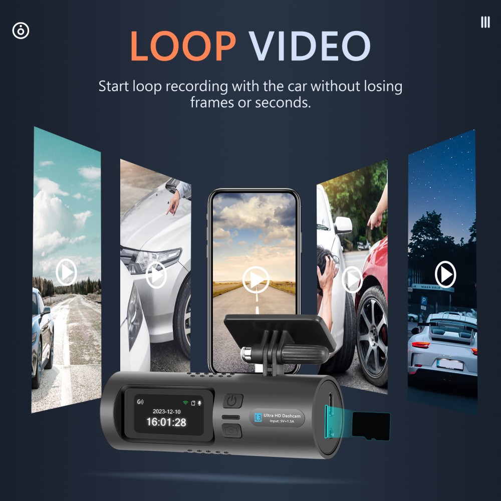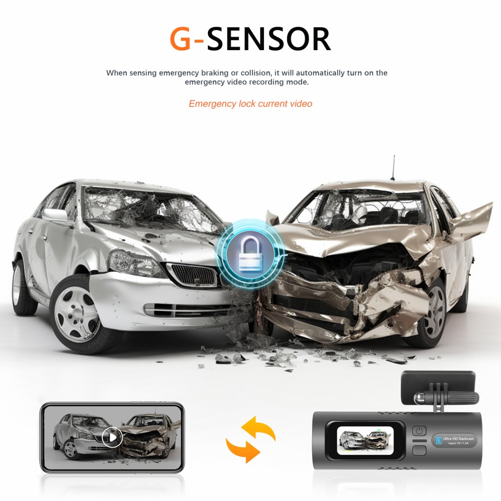 4.Smart Emergency Recording,The G-sensor will automatically save and lock video in case of sudden impact or collision, Loop Recording will also skip the emergency locked video.
