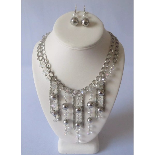 Cg Fashion Necklace And Earring Set Silver Tone Two Line Chain With Beads Fringe.
