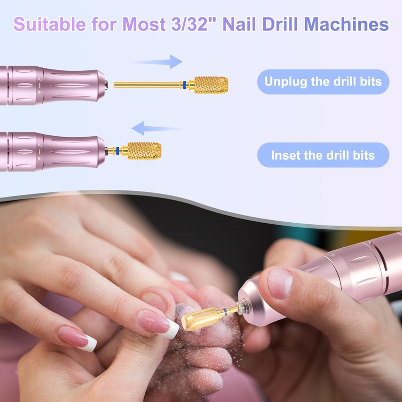 - Universal 3/32 inch nail drill bits: universal 3/32 inch nail drill bits fit most electric or rechargeable manicure nail file machines. Perfect for nail salon, beauty salon, spa or personal manicure pedicure, DIY nail art at home.