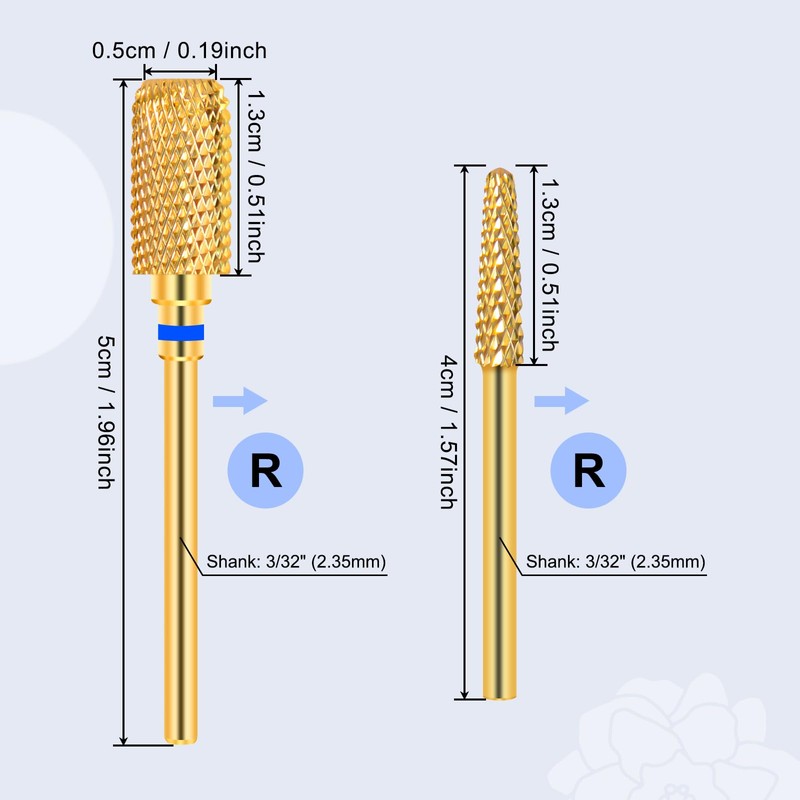 - Quantity: 2 pieces | Color:Gold | Grit: Medium - M | Shank Size: 3/32 inch | Shape: Cylinder + Shade | Right Hand Use