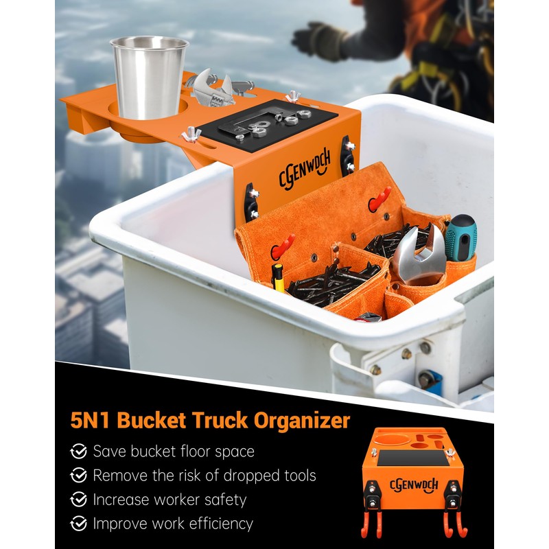 - 5-in-1 Bucket Truck Organizer: Bucket truck tool tray include multi-sized cup holders, storage compartments, magnetic plates, two large hooks and 4 tool hanging holes, which can hold a variety of tools, improve work efficiency, save bucket space, and eliminate the risk of falling objects when working at height, improving worker safety