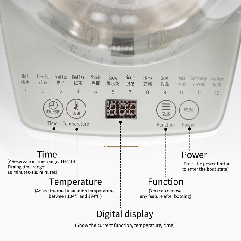 - [12 in 1 function] Burn water, flower tea, fruit tea, black tea, noodles, water stew, soup, medicated diet, desserts, milk, porridge porridge, insulation of 12 major functions, one pot for multiple uses. It is programmable and easy to operate. The kettle is also equipped with a egg rack, allowing you to cook 5 eggs at a time.