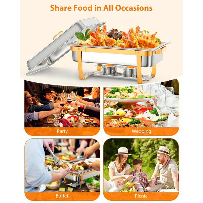 • 【Complete Component Included】- 2 x Rectangle Lids; 2 x Food Pans; 2 x Water Pans; 2 x Chafing Dish Frames; 4 x Fuel Cans;