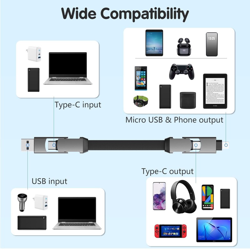 - 6 in 1 Multi Charging Cable has 6 kinds of cable input and outputs (USB A and USB C, Micro USB, LT input). Charge your device quickly