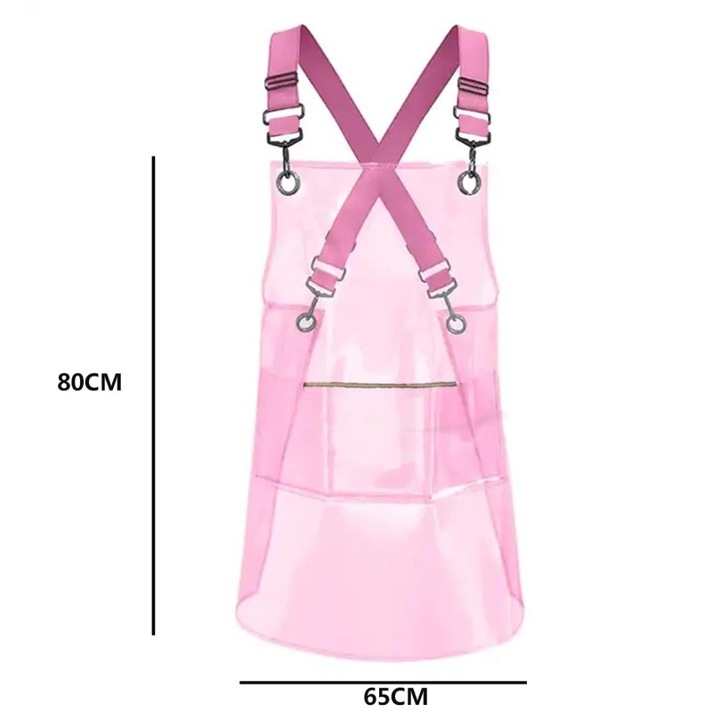 - CLEAR STANDARD SIZE FRONT Our kitchen apron is one size fits all, which is made to the dimensions of our average customer and is suitable for both women and men. The dimensions of our transparent waterproof hairdressing apron are 82cm high and 58cm wide. Easily adjustable with two straps at the waist. Waterproof kitchen apron, one size fits all body types and sizes.