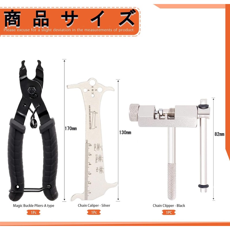 - (3-piece bicycle tool set) Can be used with all bicycles, including bicycle chain cutters, chain checkers, missing link pliers, and missing links (only suitable for 5, 6, 7, 8, 9, 10, 11, 12 speed bicycle chains)