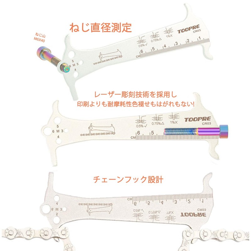 - Chain Checker: The measuring device can measure the amount of wear of the chain (to immediately replace the chain to the level of wear and tear for a safe and secure bicycle). The surface of the tool has a 2.4 inches (6 cm) long measuring scale. The round hole on the tail of the tool can measure the diameter of the screw, making it convenient for you to select the correct size screw. Chain repair makes it easy to handle