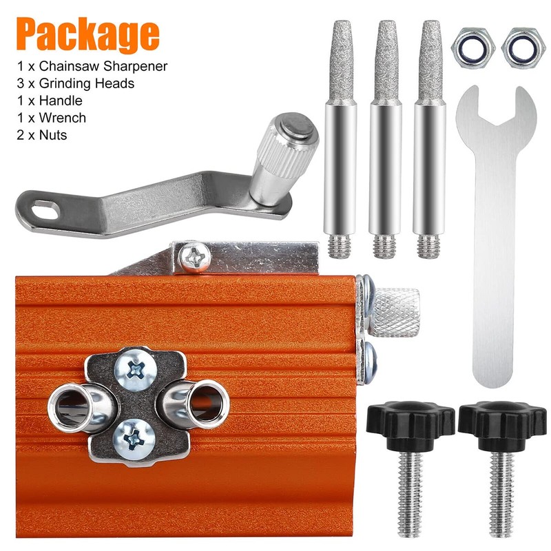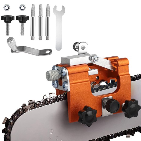 - Perfect Design: Standard 30° sharpened front angle, an anodized aluminum fixture with a detachable crank, and a set of guide bushings can be used with most chain saws.