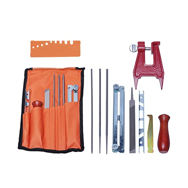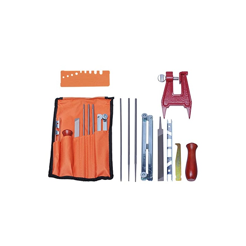 Chainsaw Sharpener File Kit for Sharpening Filing Chainsaws - Include Files, Wood Handle, Depth Gauge, Filing Guide, Tool Pouch & Chainsaw Filing Stump Vise by Poweka
