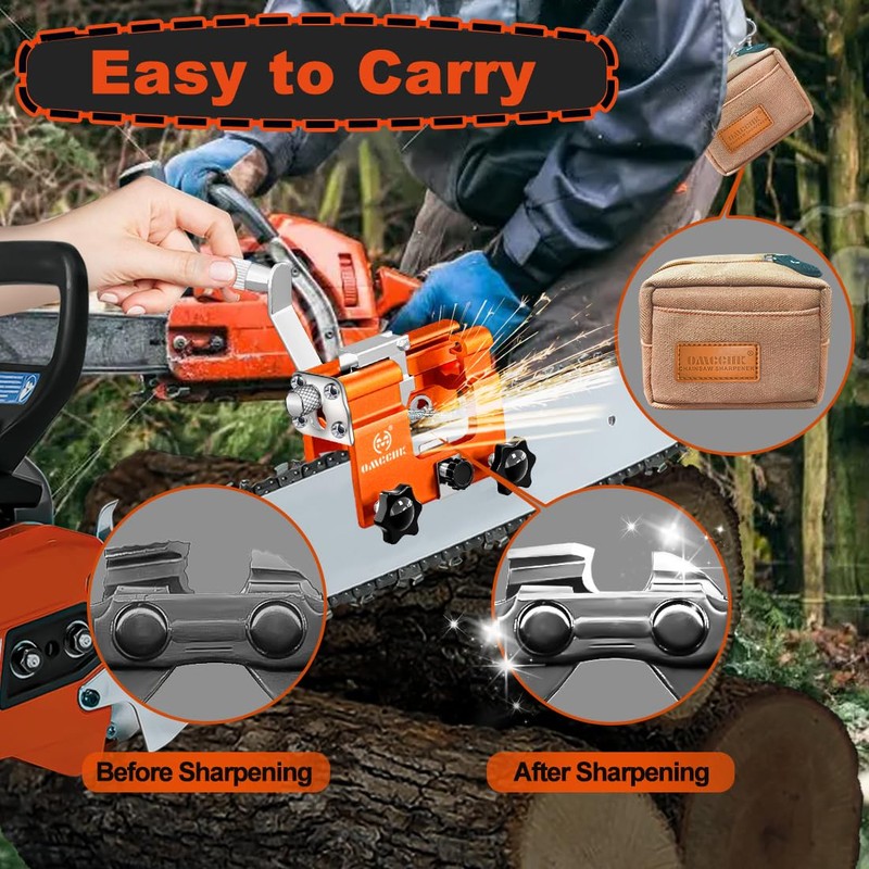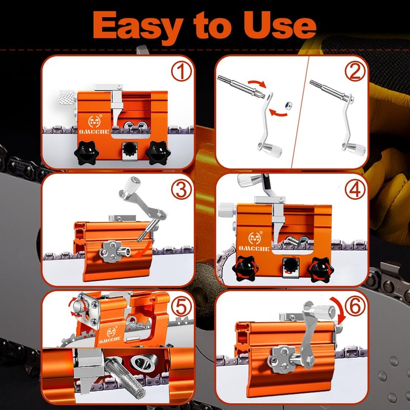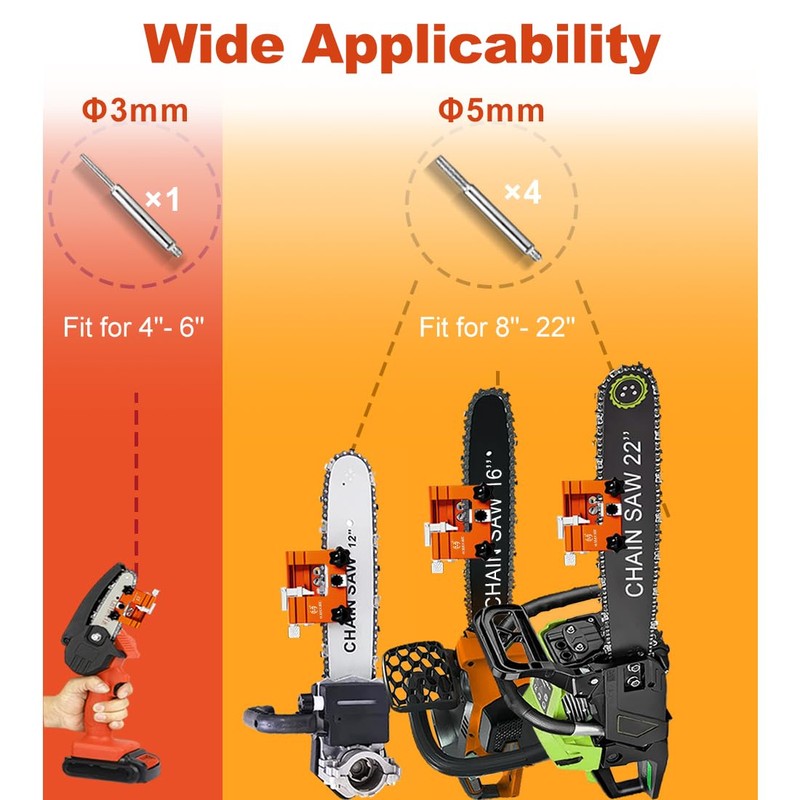 • Universal Chainsaw Sharpener: The chainsaw sharpening is suitable for most chain saws, such as gas or electric chain saws. The chain saw sharpening jig kit includes 5 sharpening burrs in two sizes, with 2 sharpening burrs for 4 "- 6" chain saws and 8 sharpening burrs for 8 "- 22" chain saws. Chain saw sharpening jig is a universal hand chain sharpener that is easy to sharpen chain saws.