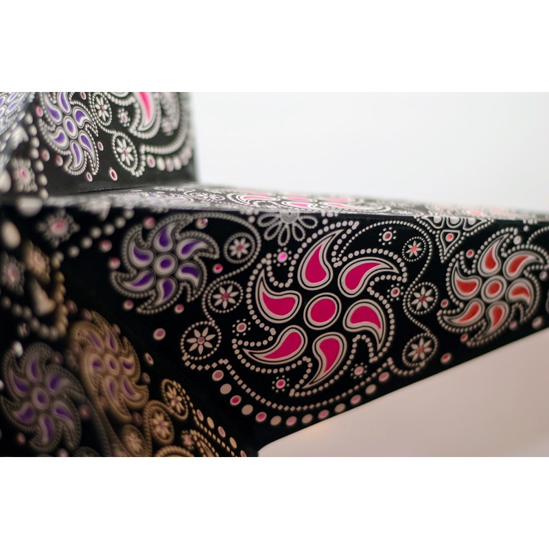 • Bold and stylish contrast comes from hand printing and hand cut paper inserts.