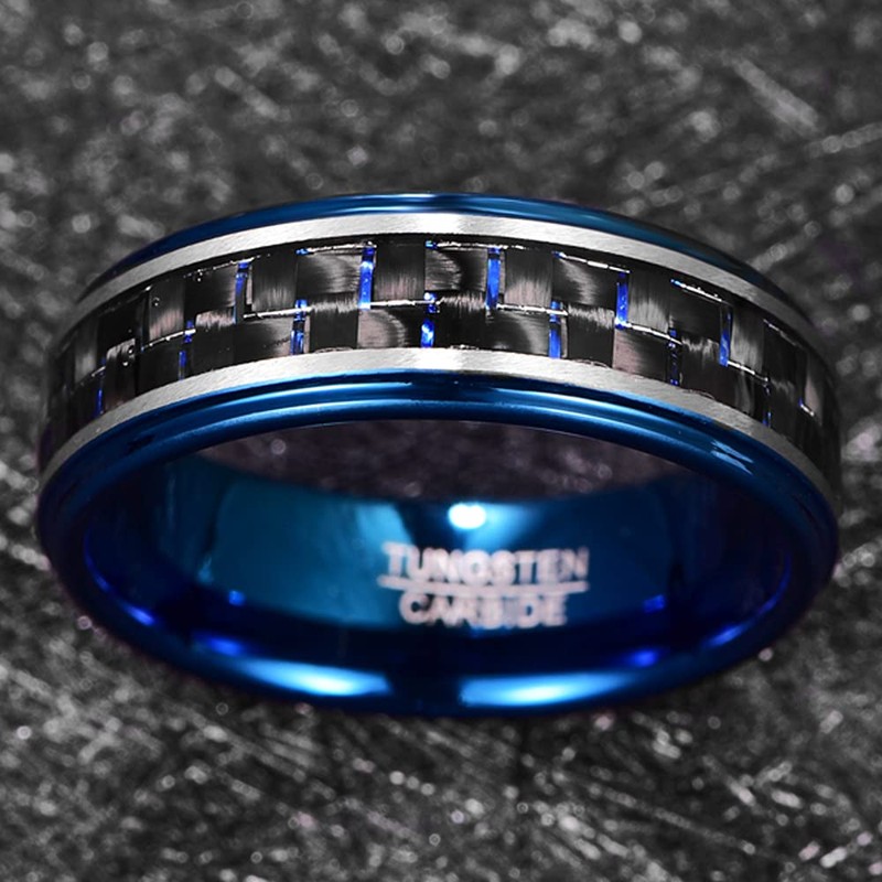 - Design: The combination of 8mm men's black tungsten ring with blue/red carbon fiber gives you a visual treat.