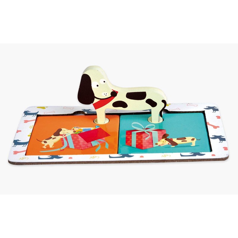 • SELF CORRECTING PUZZLE : Check your answers with the wooden dog. Make a match and if you're correct, his little feet will fit the holes in the picture cards. If you're wrong, you will see him struggling to stand as his feet wonÕt fit in the holes.