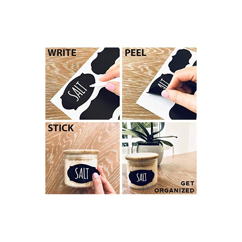 - PREMIUM QUALITY:Matte texture with a crisp clean uniform dye cut shape. The surface is not shiny or slippery, strong and durable for an appealing look. These Premium Chalkboard Labels allows regular chalk or any liquid chalk maker to write on. The ink dries quickly and it doesn't flake off.Dishwasher and refrigerator available.