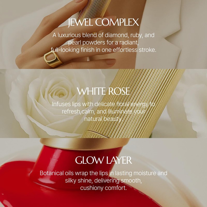 - [White Rose & Natural Oil Glow-Coating Layer] A thin, flexible glossy veil keeps lips feeling cushioned and comfortable.