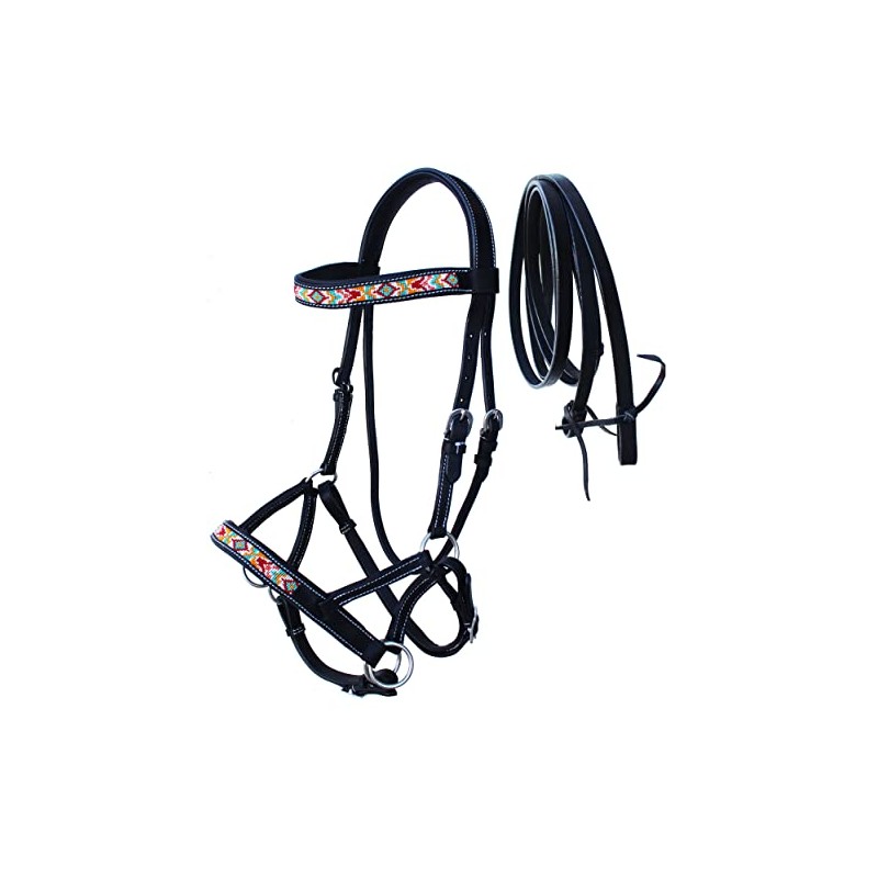 CHALLENGER Horse Western Black Leather Beaded Bitless Padded Sidepull Bridle Reins 77RS23BK
