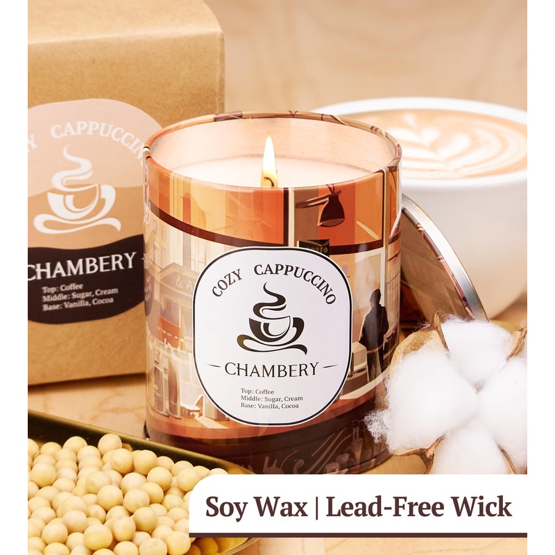 CHAMBERY Cappuccino Candle | West Coast Café Ambiance in Premium Tin | Soy Wax with Lead-Free Cotton Wick | 55-Hour Burn | Enveloping Fragrance for Fall & Winter