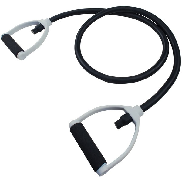 package. Featuring a plastic swivel handle with grips, this resistance tubing