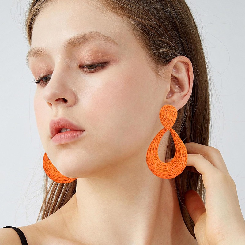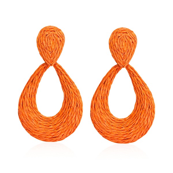 Chanaiqw Teardrop Handmade Statement Raffia Earrings Cute Boho Rattan Dangle Lightweight Straw Wrap Summer Drop Dangling Earrings for Women (Orange)